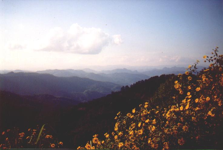 This is the season of the wild growing mexican sunflowers which grow all over the mountains, so they look yellow. End of November the SUNFLOWER Festival takes place in Khun Yuam, a colourful festival around this flower.